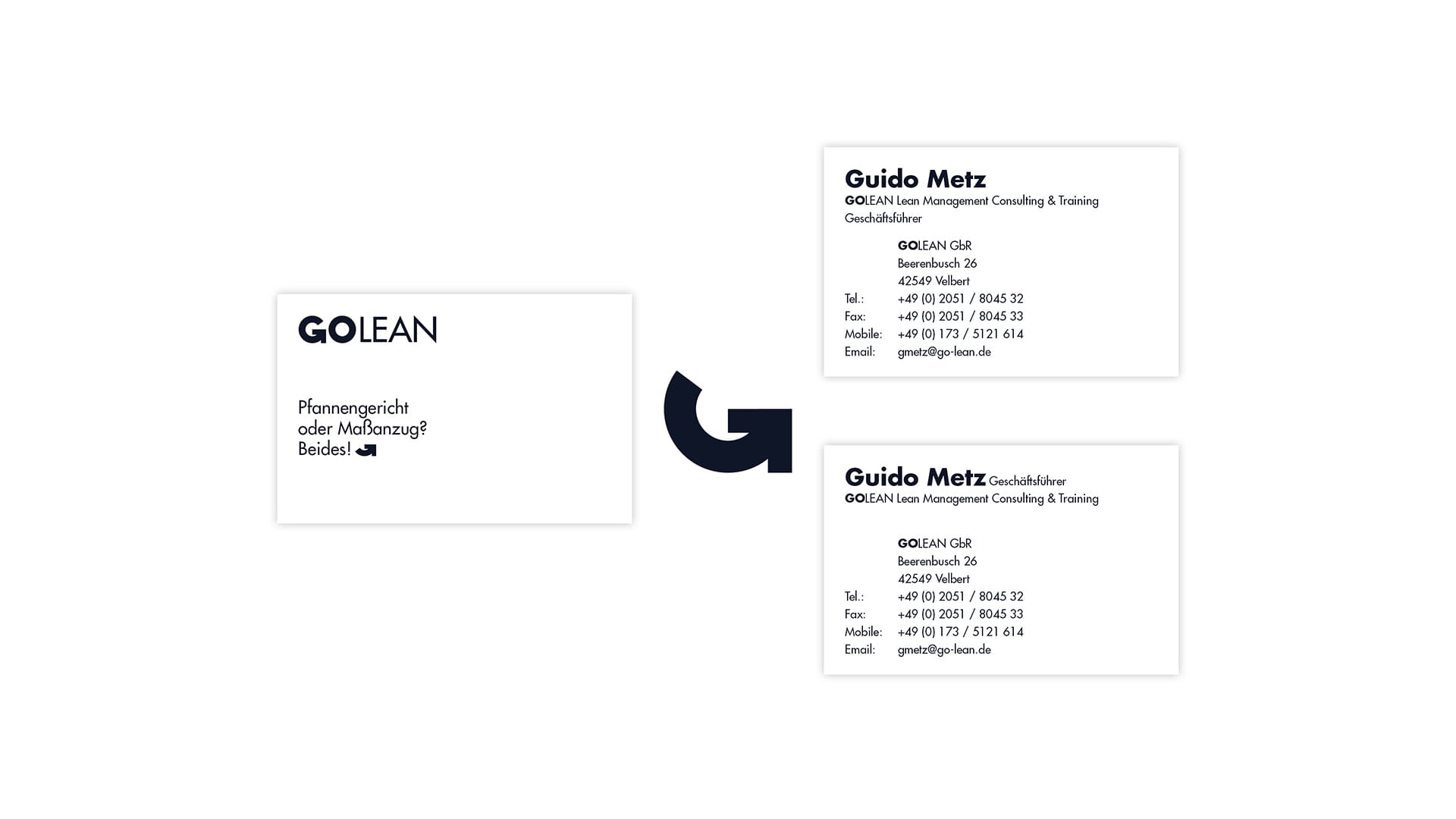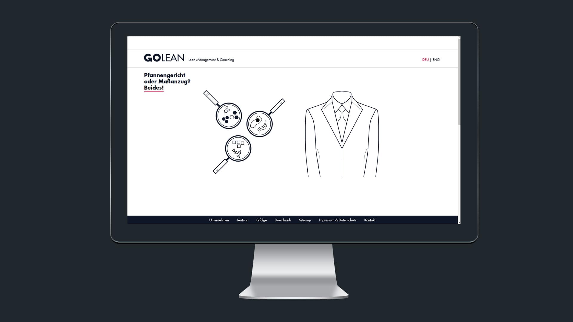 GOLEAN ist eine besondere Unternehmensberatung die etwas andere Wege geht als die Konkurrenz. Und das auch völlig zu Recht. Sie leben den LEAN Gedanken und sind spezialisiert auf die Entwicklung von individuellen Konzepten, die auf die jeweiligen Kunden maßgeschneidert werden. Andere Unternehmensberatungen verkaufen häufig Ihre Standard Tools. GOLEAN nennt das heute »Pfannengerichte«. Der »Maßanzug« ist aber grundsätzlich immer die bessere Wahl. »Pfannengericht« oder »Maßanzug« – Das war dann später auch unser Leitmotiv für das neue Corporate Design.