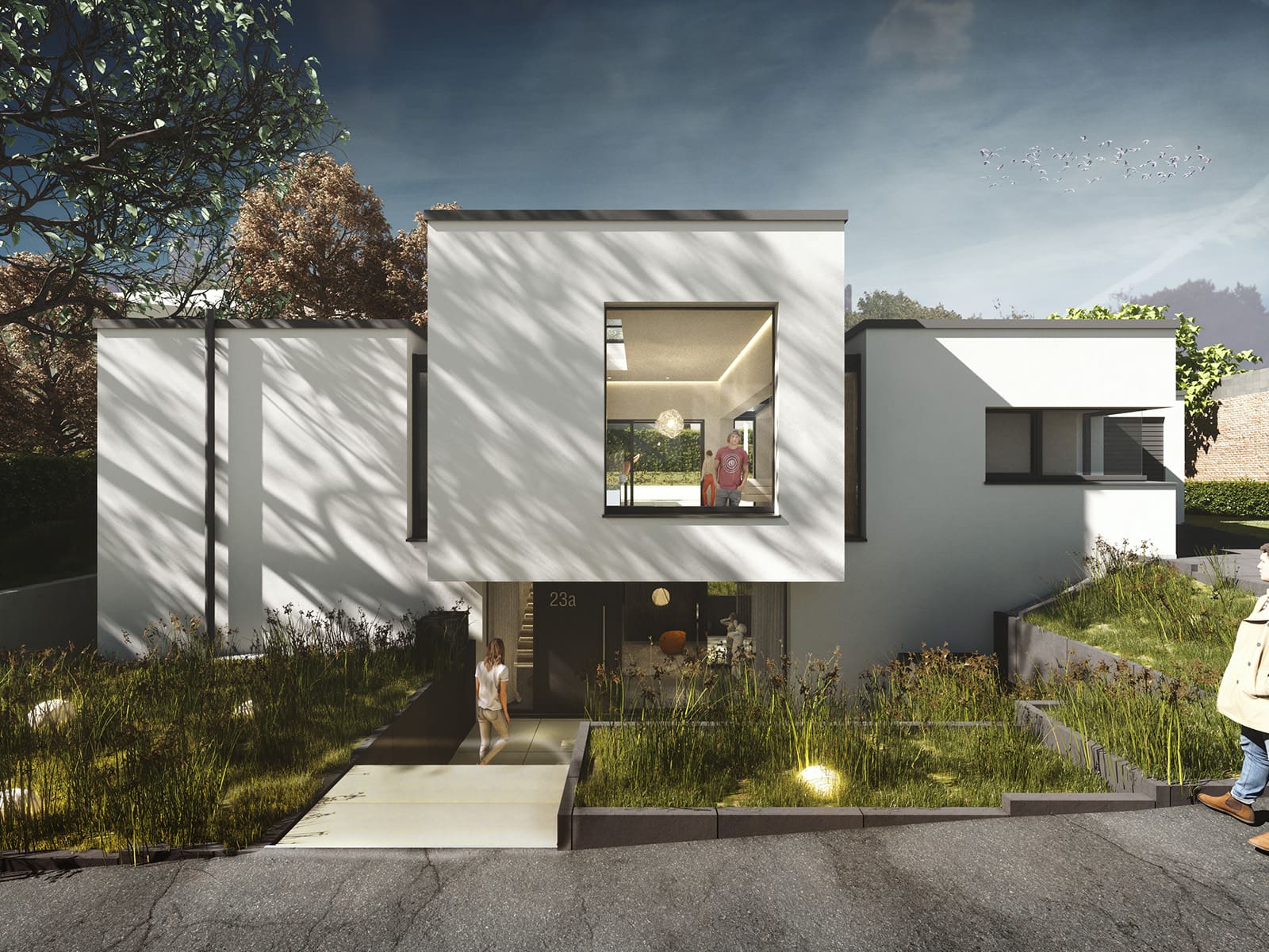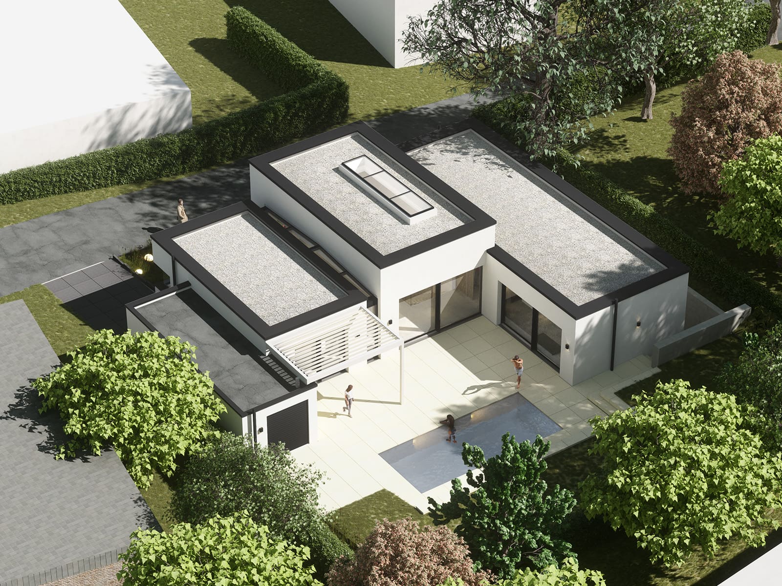 Ursprünglich wurde ich mit der Sanierung und Erweiterung eines alten Bungalows aus den 60er Jahren beauftragt. Der allgemeine Zustand des erst vor einigen Jahren erworbenen Objektes, die schwierige Bestandsstatik, die Topografie und die Bodenbeschaffenheit und die baurechtlich schwierige Ausgangslage führten dann zu der Überlegung den alten Bungalow abzureißen und das Haus komplett neu zu denken.