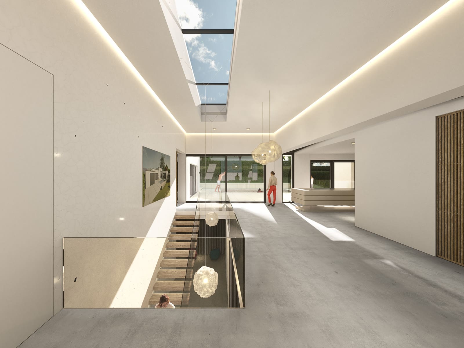 Es gilt der sogenannte §34 nach dem man sich bei einem Bauvorhaben an der direkten Umgebung orientieren muss. Obwohl zu 3 Seiten 2 geschossige Gebäude das Ortsbild prägen wurden wir baurechtlich gezwungen einen eingeschossigen Baukörper zu bauen. Um das Raumprogramm abzubilden, wurden wir so herausgefordert die Typologie des Bungalows neu zu denken.