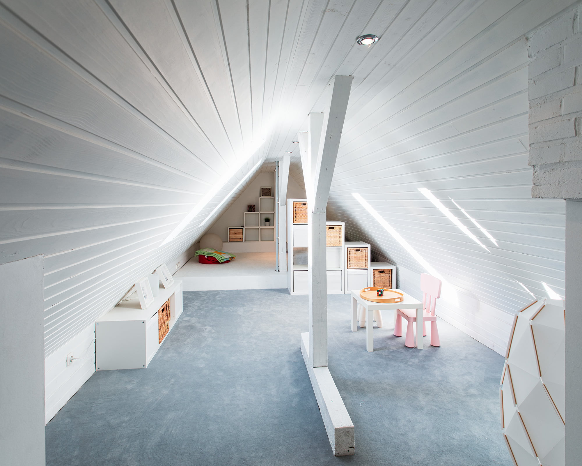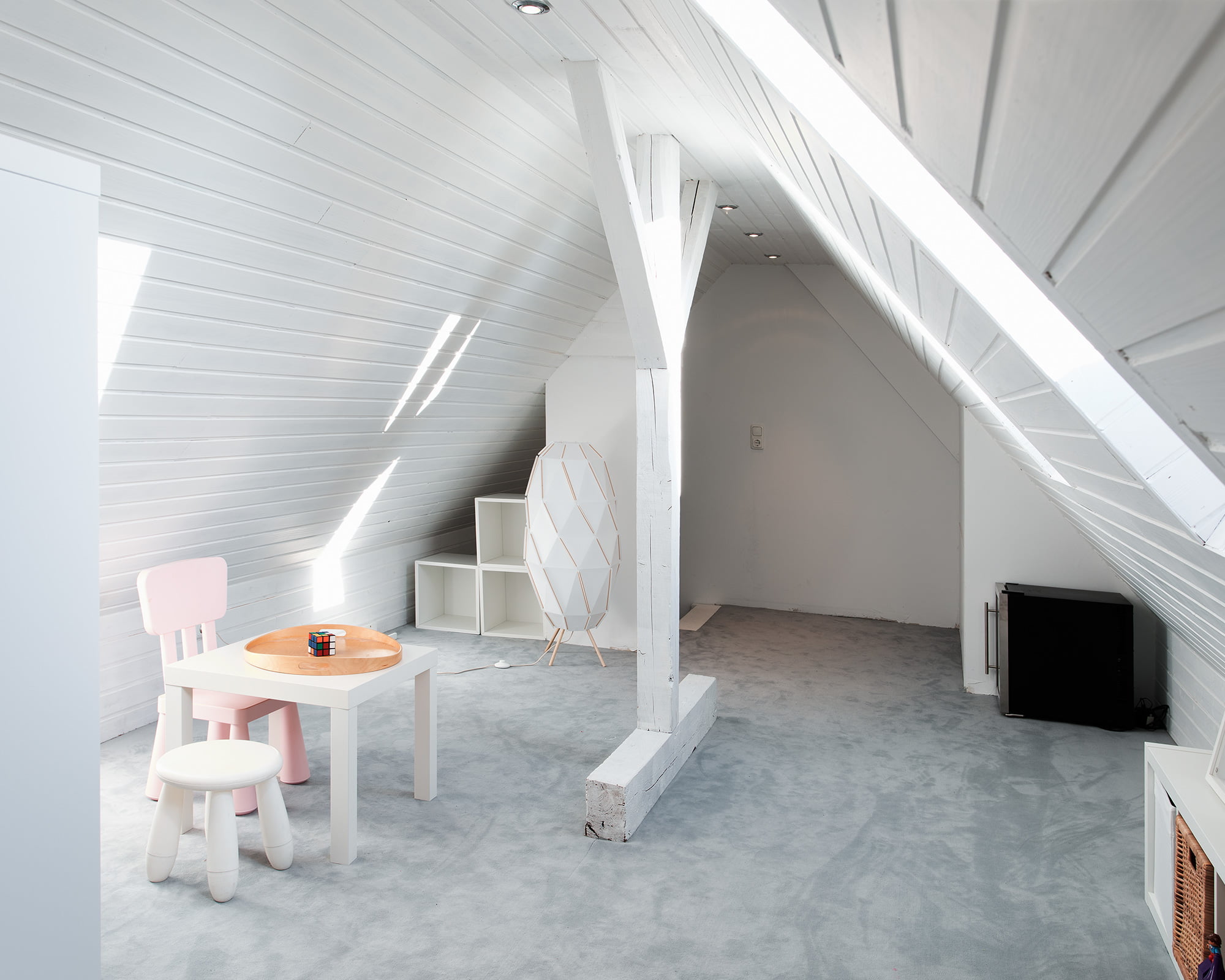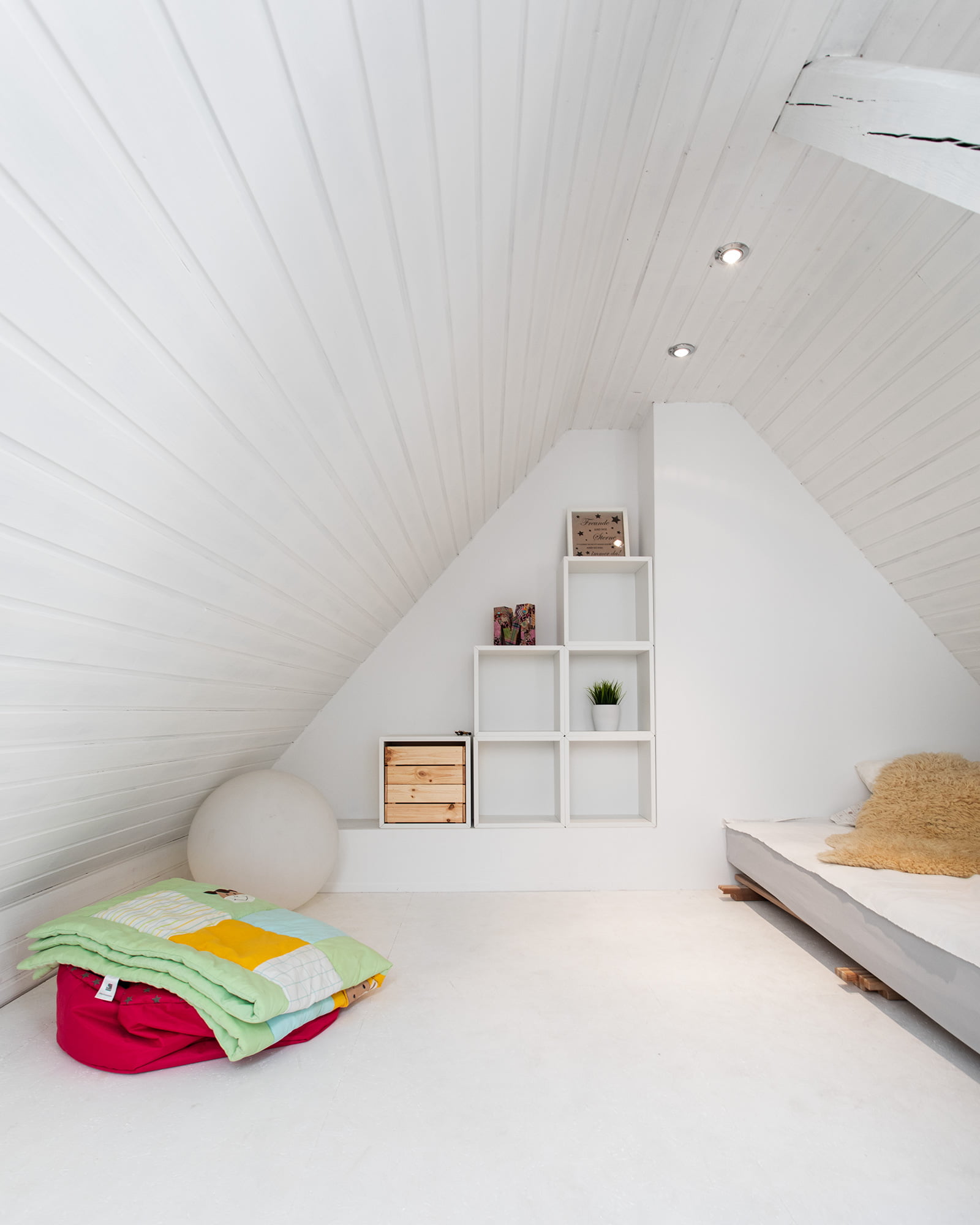 Die bestehenden Holzverkleidungen der Dachflächen wurden abgeschliffenen und anschließend weiß gestrichen. Trotz der zwei kleinen Dachflächenfenster ist der Raum so sehr hell und einladend.