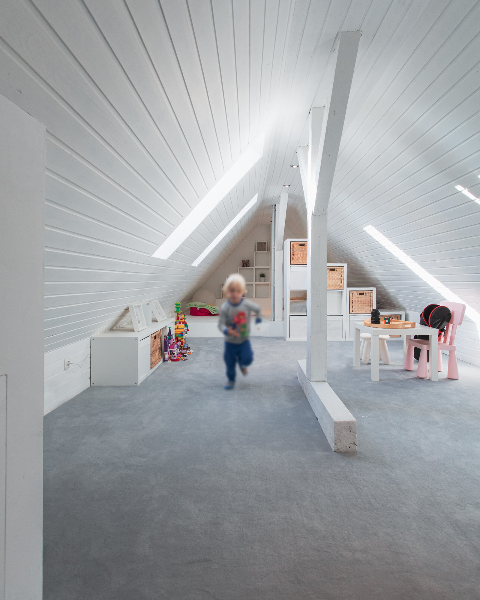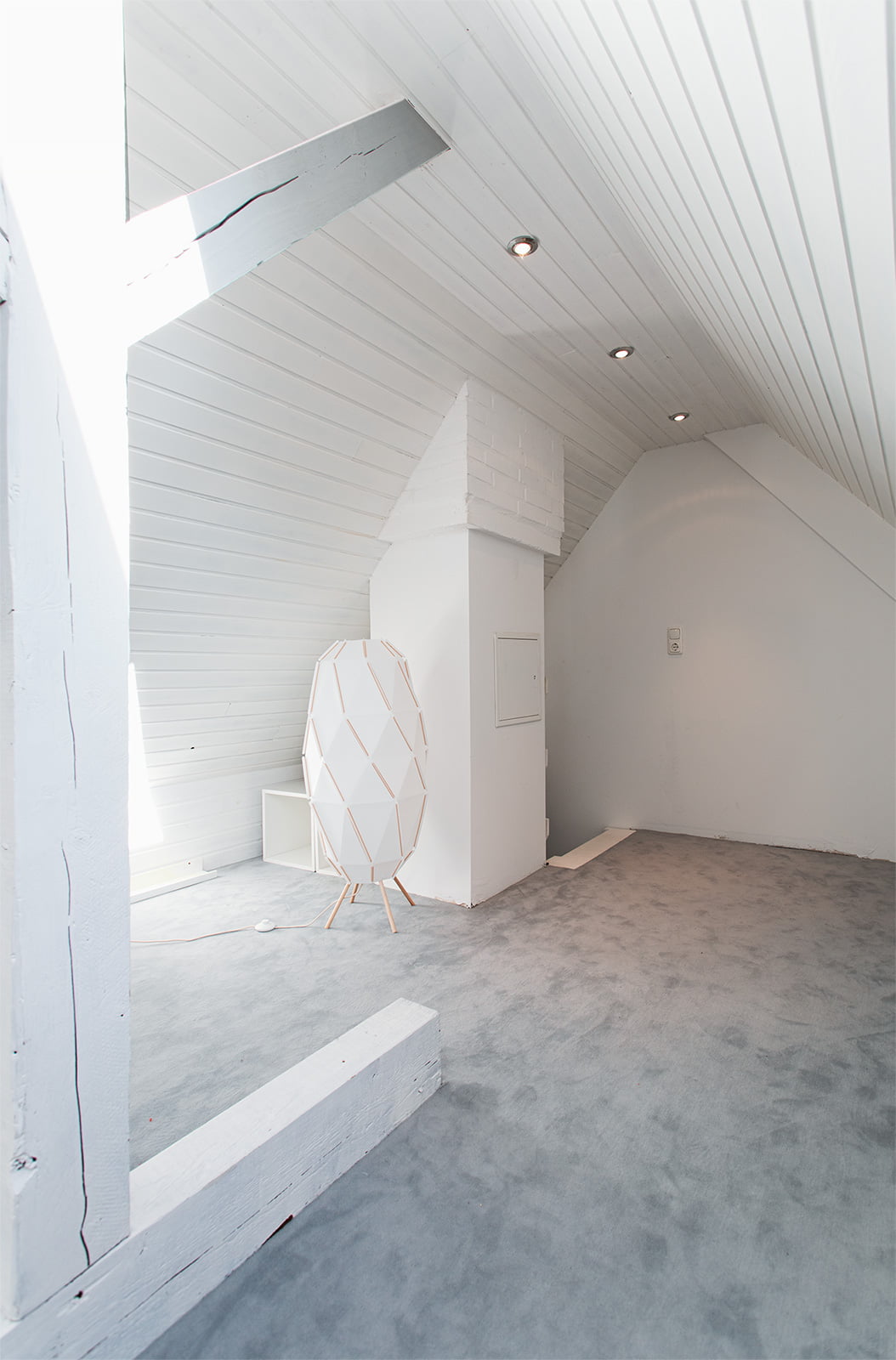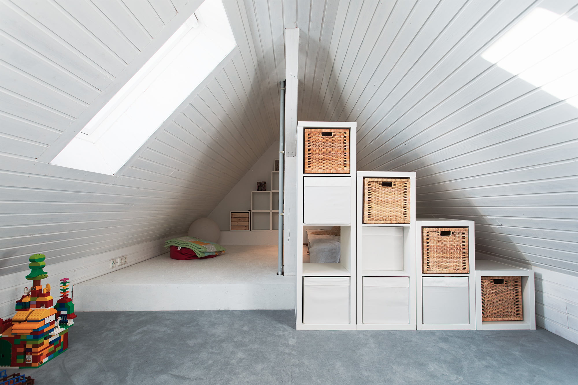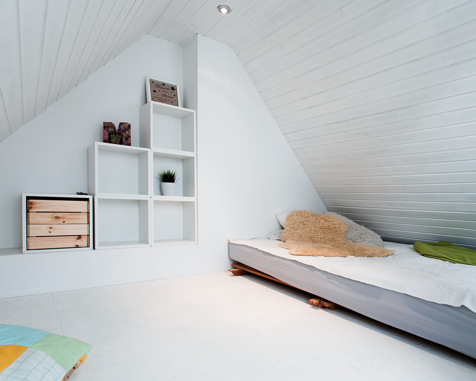 Die bestehenden Holzverkleidungen der Dachflächen wurden abgeschliffenen und anschließend weiß gestrichen. Trotz der zwei kleinen Dachflächenfenster ist der Raum so sehr hell und einladend.