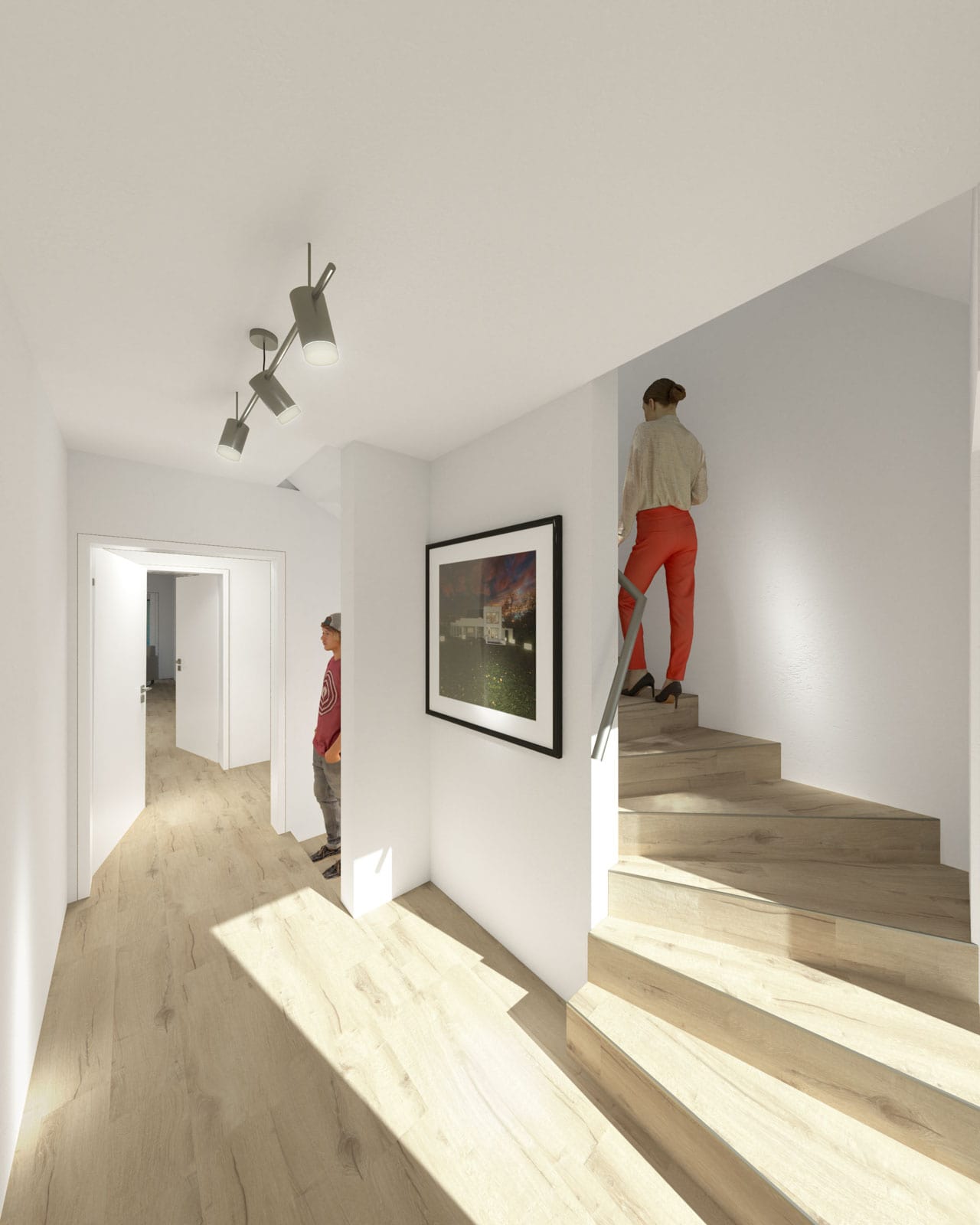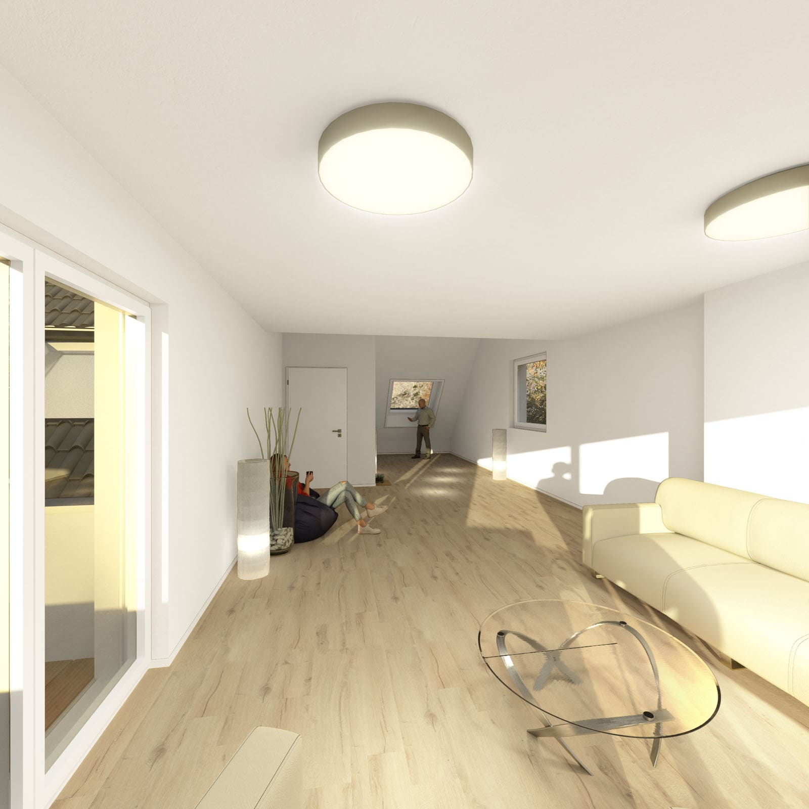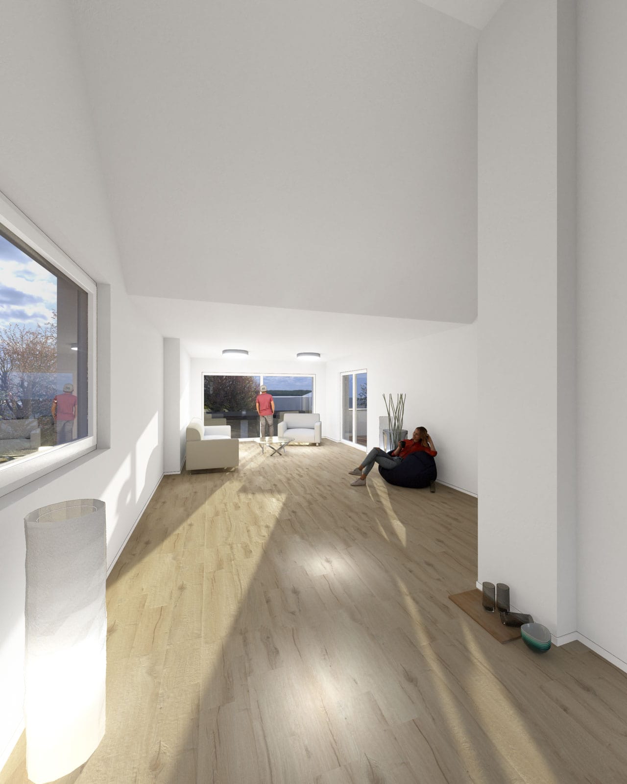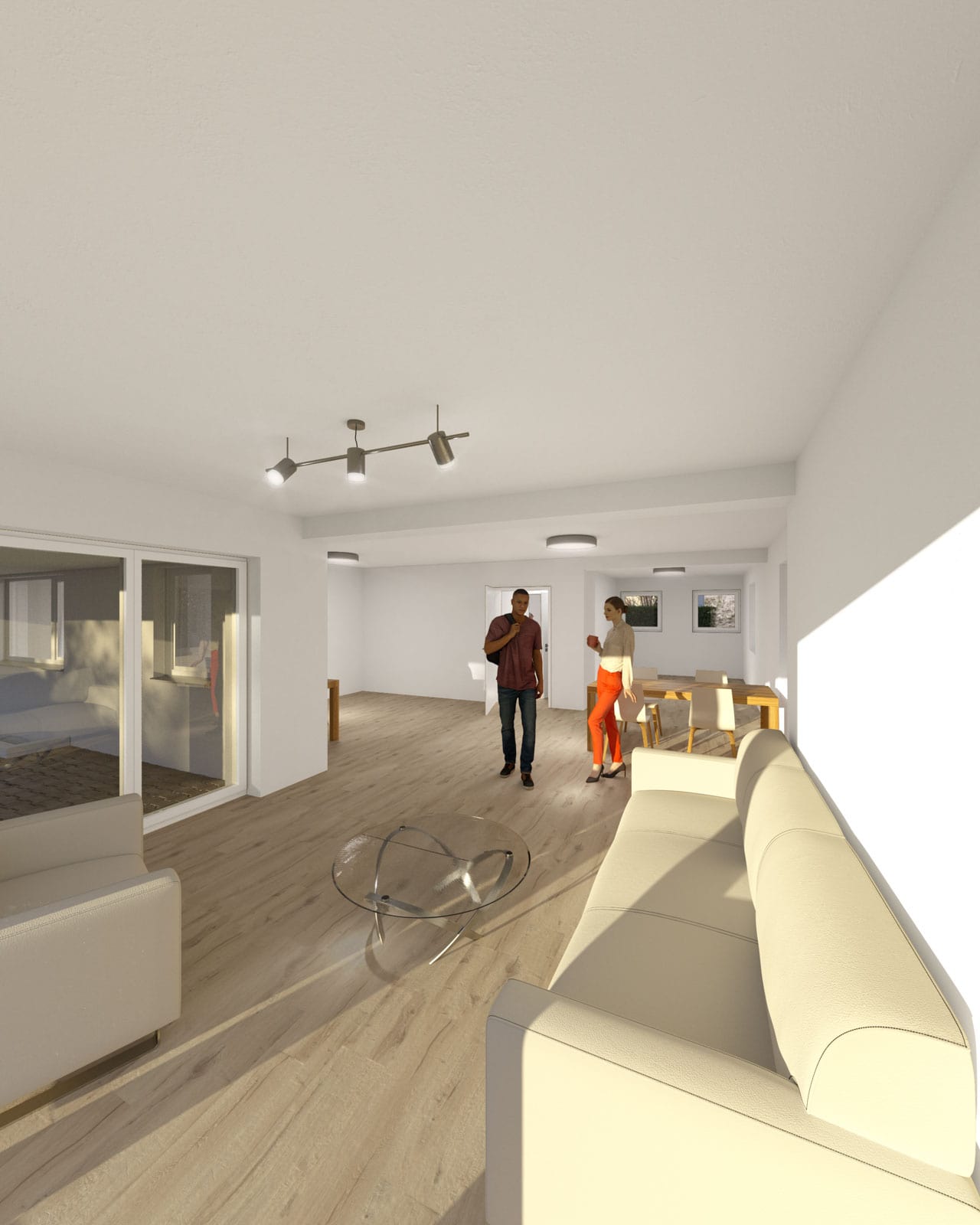 Doch lange bevor der der erste Stein abgebrochen wurde, entwickelten wir das Architektonische Konzept unter Anderem in Form von fotorealistischen Renderings die den exakten Sonnenverlauf nach Tages- und Jahreszeit simulieren. Wichtig war auch der Bodenbelag, den wir in verschiedenen Varianten visualisierten. Die Texturen wurden uns dabei mit freundlicher Unterstützung der Firma GERFLOR bereitgestellt. Schlussendlich entschied sich die Bauherrin für den Designboden Creation 55 Cedar Pure.