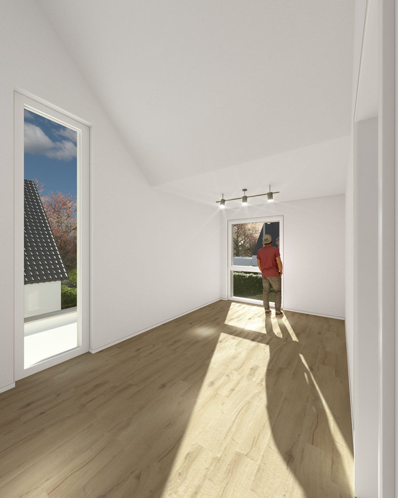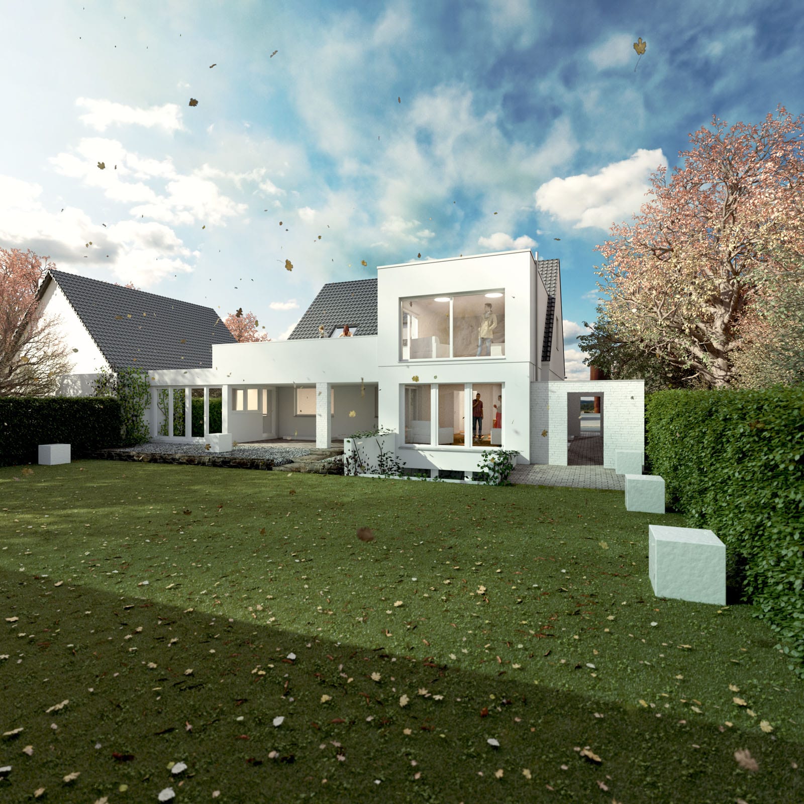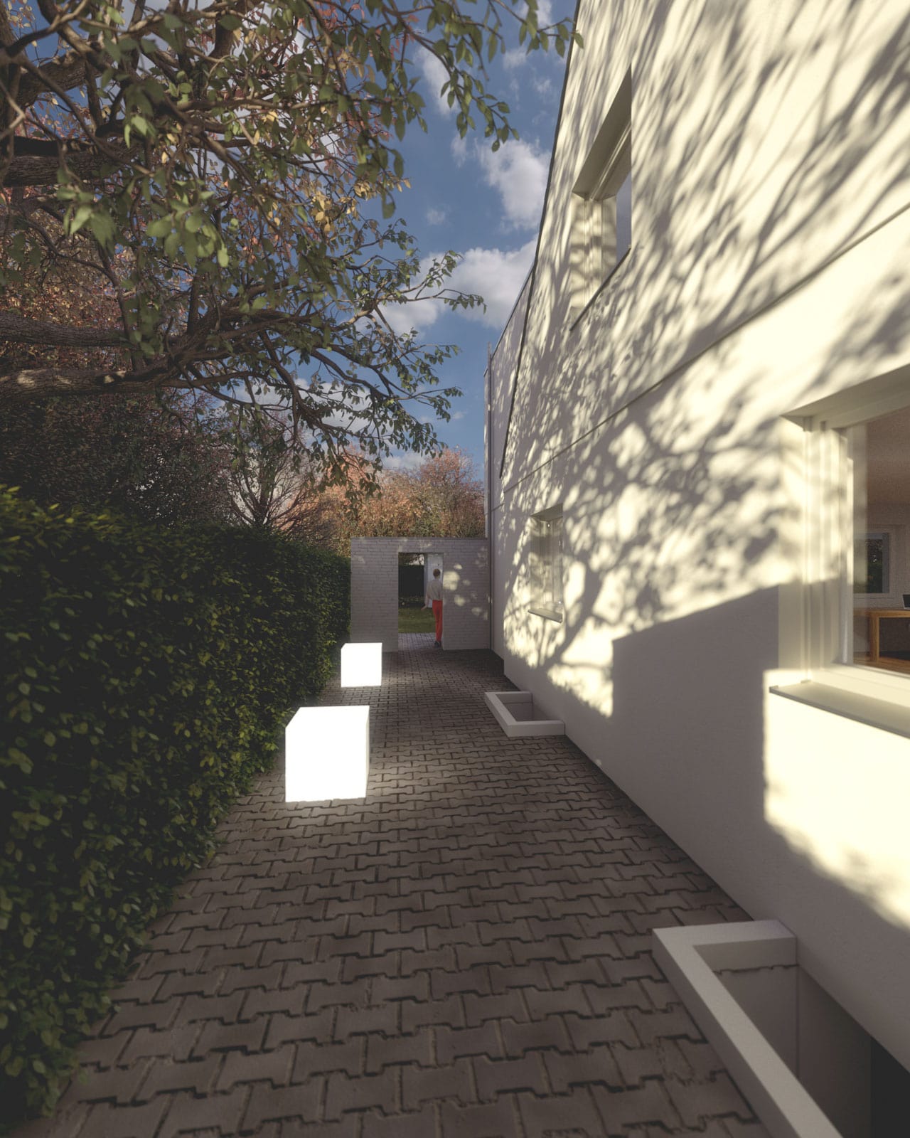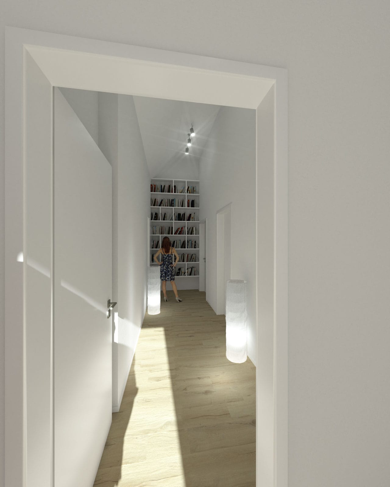 Doch lange bevor der der erste Stein abgebrochen wurde, entwickelten wir das Architektonische Konzept unter Anderem in Form von fotorealistischen Renderings die den exakten Sonnenverlauf nach Tages- und Jahreszeit simulieren. Wichtig war auch der Bodenbelag, den wir in verschiedenen Varianten visualisierten. Die Texturen wurden uns dabei mit freundlicher Unterstützung der Firma GERFLOR bereitgestellt. Schlussendlich entschied sich die Bauherrin für den Designboden Creation 55 Cedar Pure.