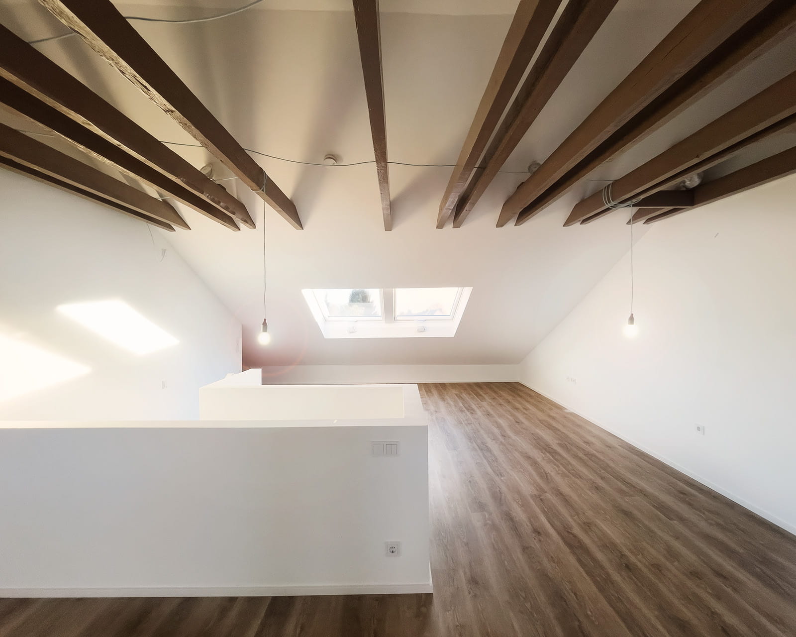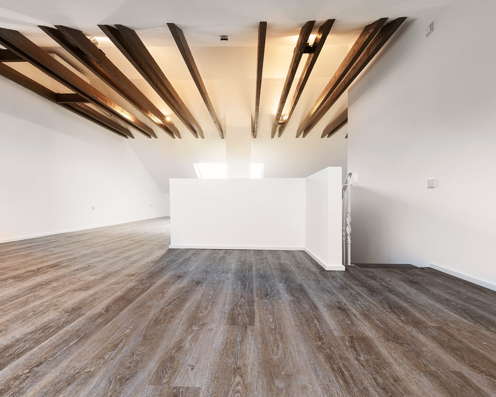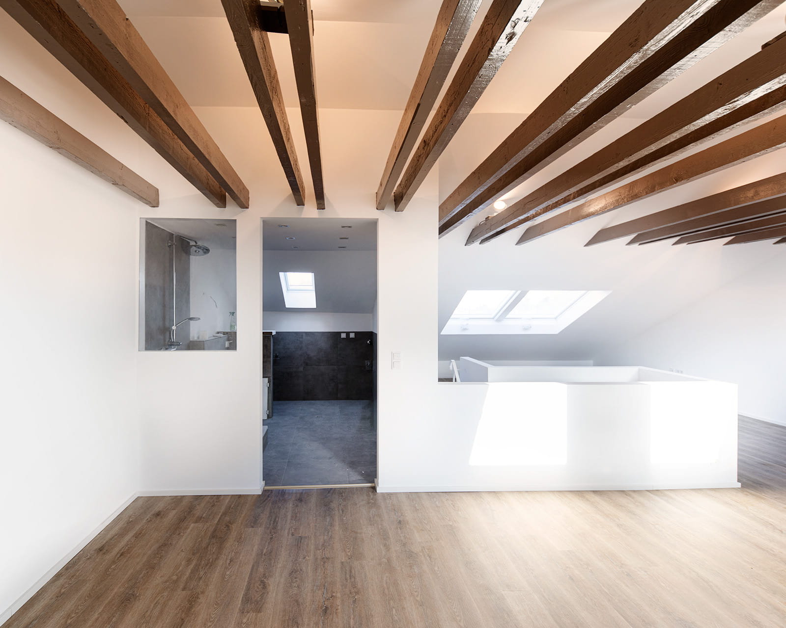 Ursprünglich war nach dem Kauf einer Maisonette Wohnung in Königsdorf durch unsere Bauherrin nur ein Wanddurchbruch im Erdgeschoss geplant. Das Dachgeschoss, so suggerierte es der Verkäufer, wurde bereits vollständig saniert. Wir schlugen außerdem vor, das Dachgeschoss durch zwei großformatige Dachflächenfenster (Velux DUO) zu öffnen.