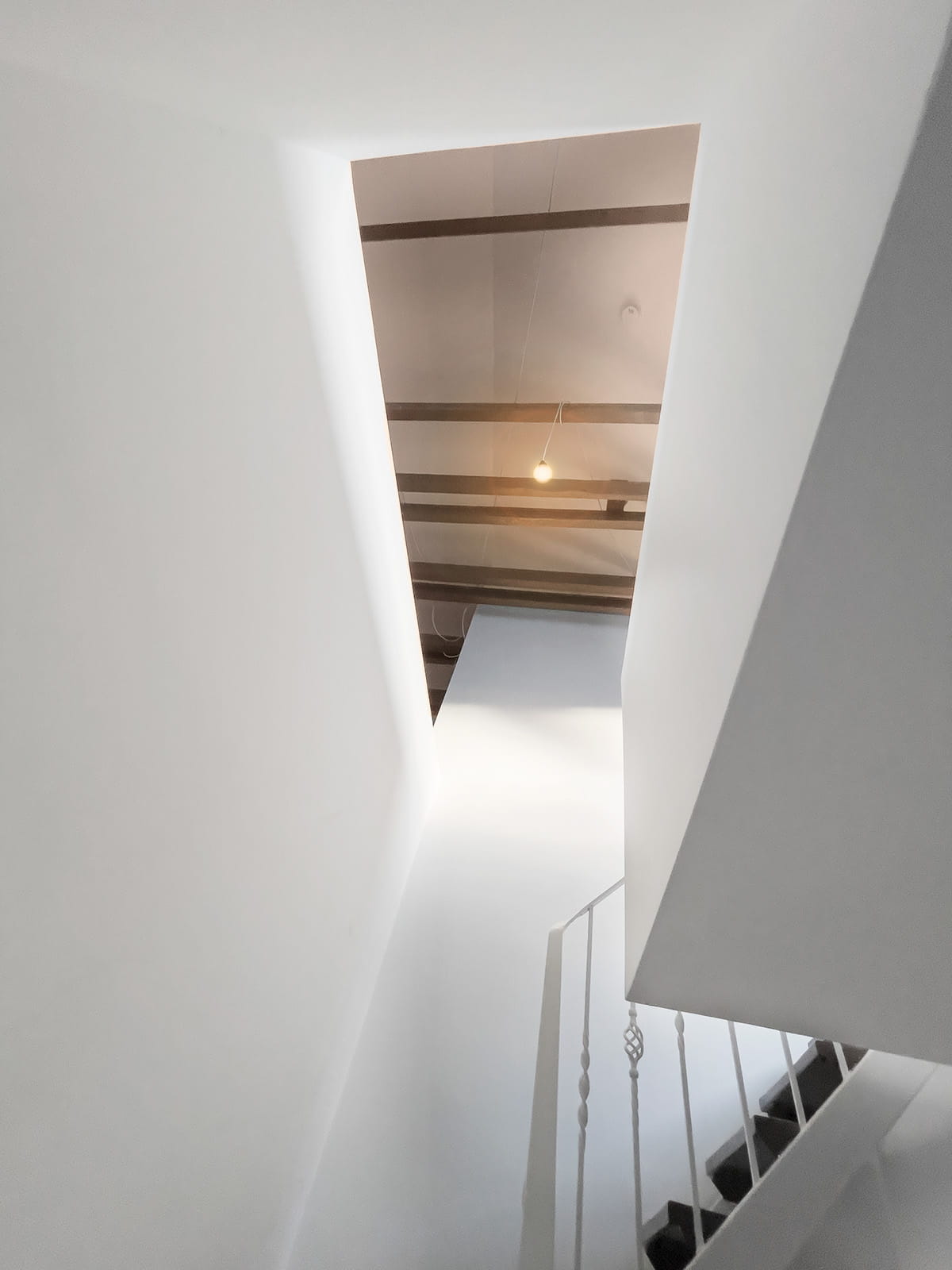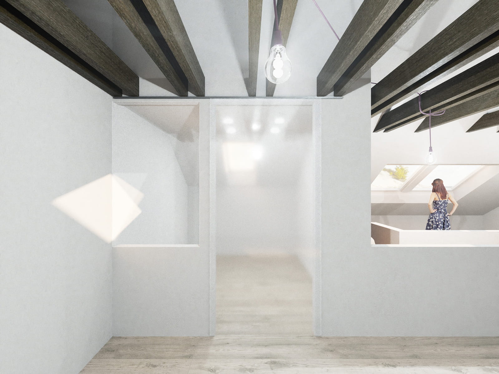 Nachdem die Entscheidung für eine neue Dämmung gefallen war, musste in »Windeseile« ein gutes Konzept her. Der Einbau der Dämmung hatte als Konsequenz, einen Abriss aller Oberflächen zur Folge. Wir öffneten den niedrigen Spitzboden und legten die Kehlbalken frei. Dadurch erhielt die Wohnung eine neue luftige und gestalterische Anmutung. Der Spitzboden wurde dann durch 6 versteckte Strahler ausgeleuchtet – Ein indirektes himmelartiges Licht entstand so. Um das primäre Licht flexibel zu halten, schlugen wir sogenannte »Wurflampen« vor, die durch die langen Kabel immer wieder auf die aktuellen Lichtbedürfnisse angepasst werden können.