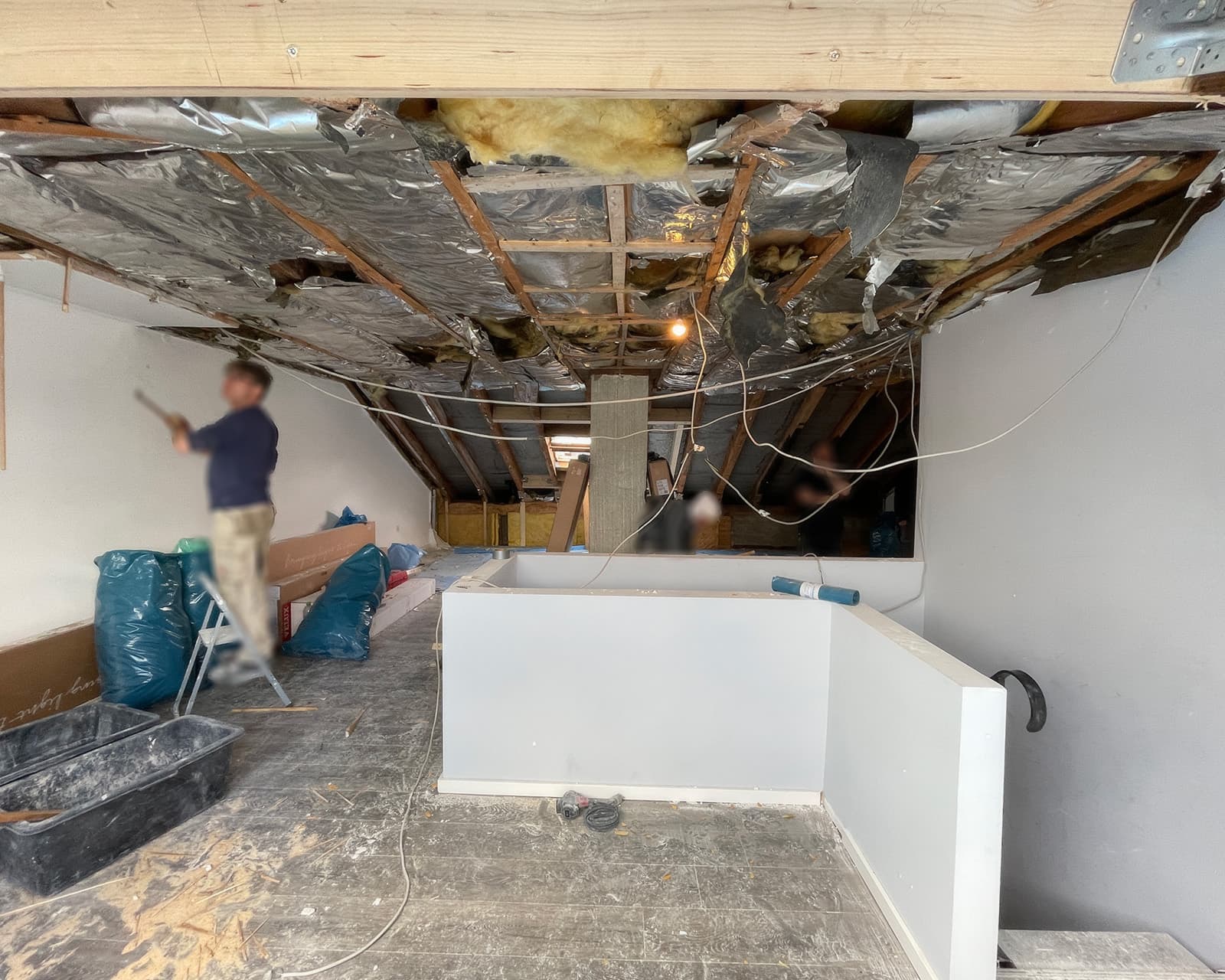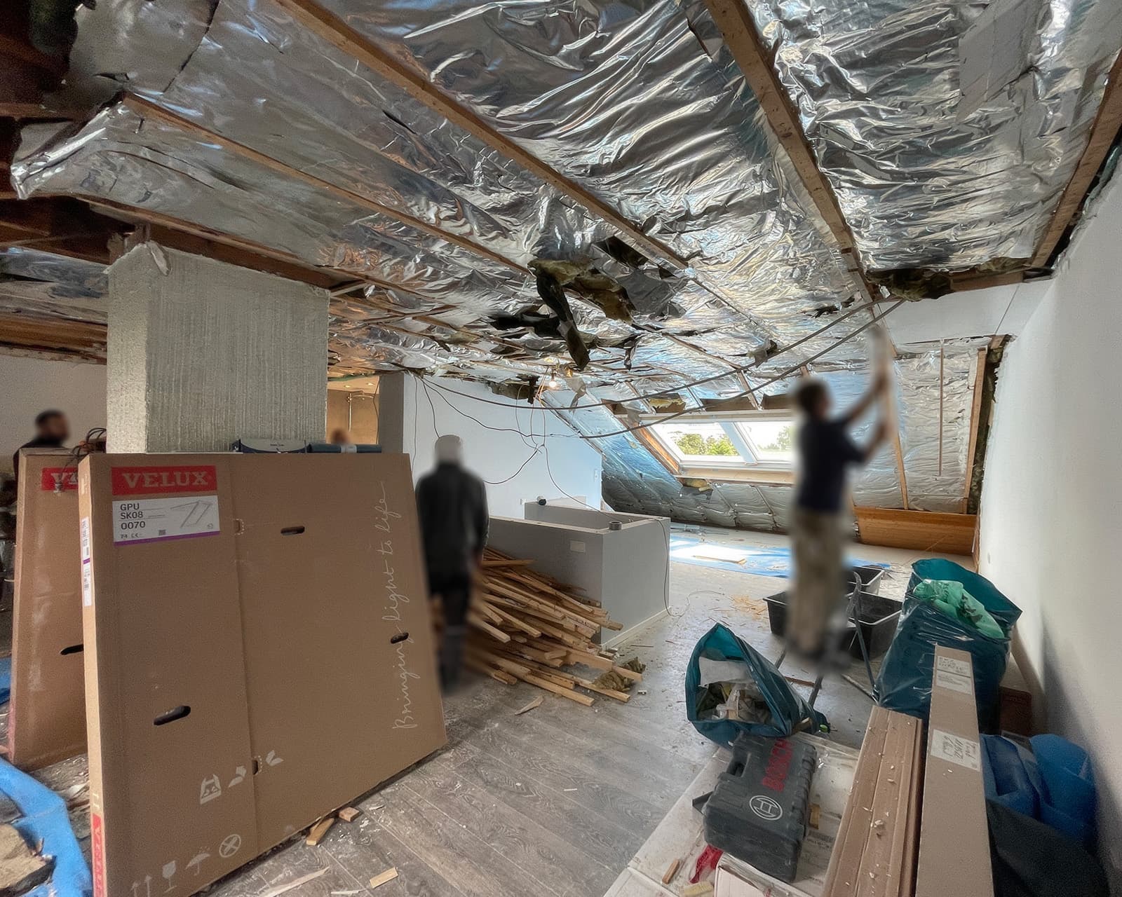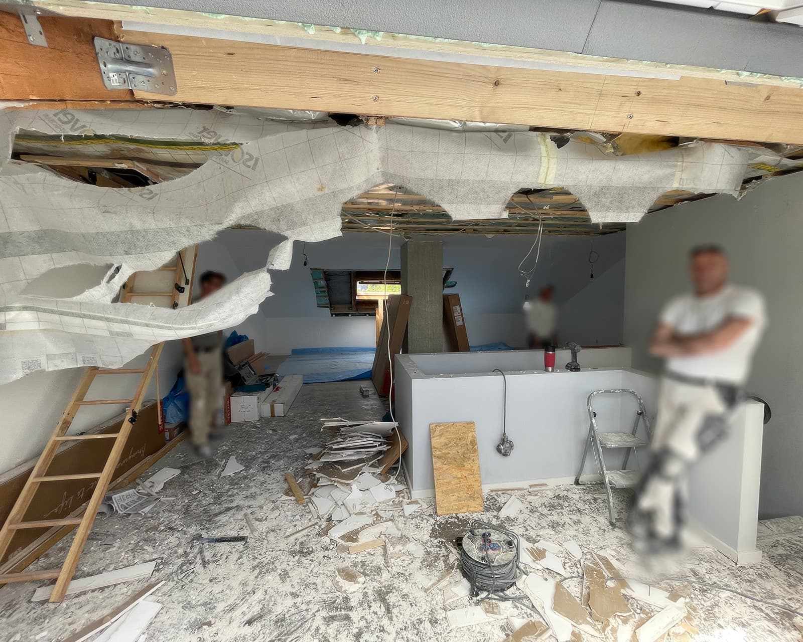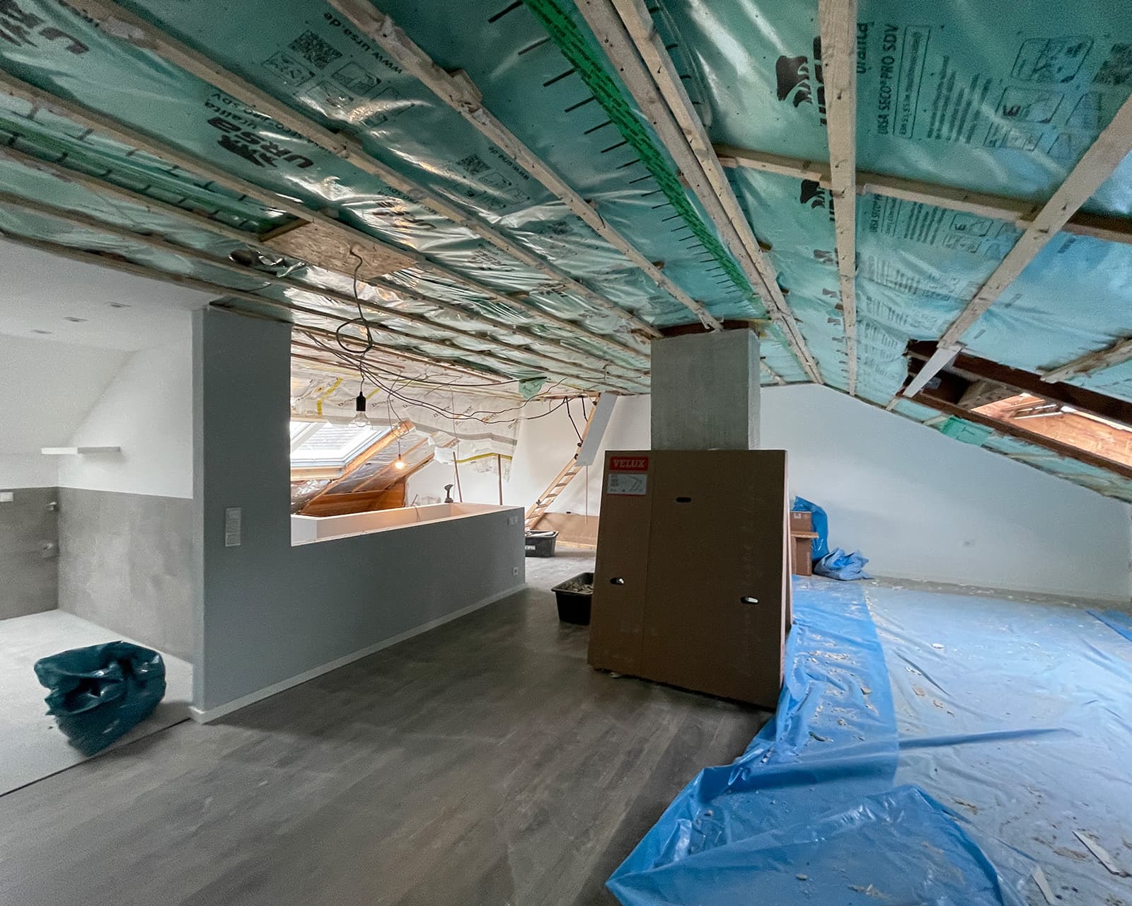 Leider stellte sich bei der Voruntersuchung und im Zuge der Baumaßnahme heraus das das DG nicht als Wohnraum genehmigt wurde und leider auch sehr mangelhaft ausgeführt wurde. An warmen Tagen war das Raumklima auch relativ schlecht und nachdem wir den Gibskarton öffneten, wurde auch klar warum es so heiß war. Wir entschieden uns gemeinsam mit der Bauherrin das Dachgeschoss komplett neu zu denken. Die nicht gut verlegte und unzureichende Dämmung sollte durch eine Holzwolldämmung ersetzt werden, die durch (unter anderem) dem höheren Eigengewicht einen hervorragenden sommerlichen Wärmeschutz bietet. Das Raumklima verbesserte sich dadurch erheblich.